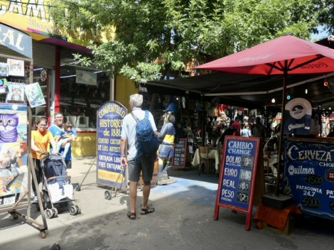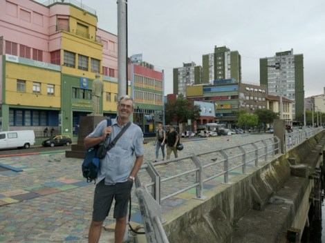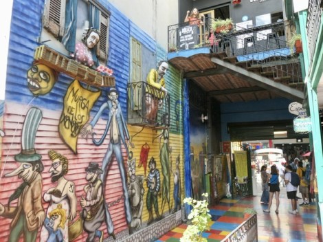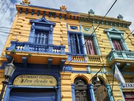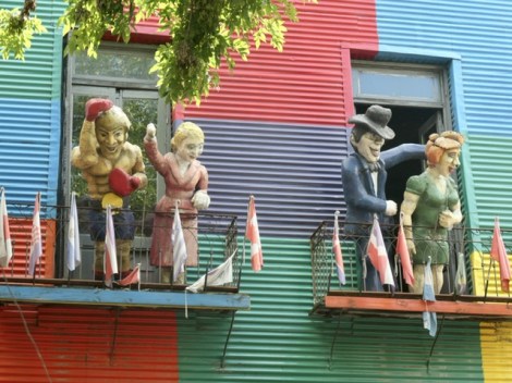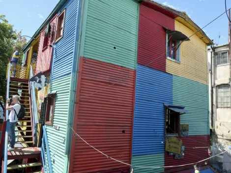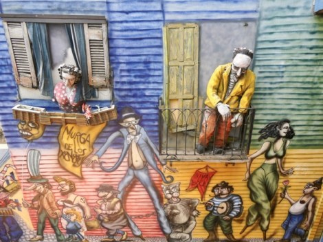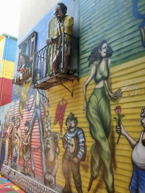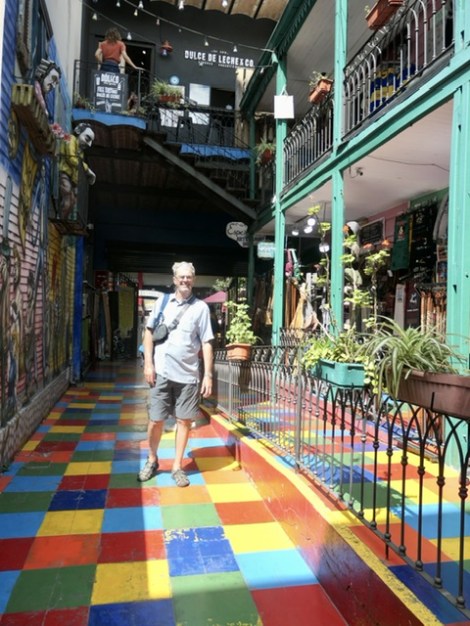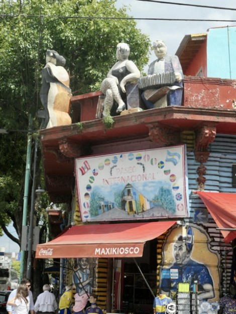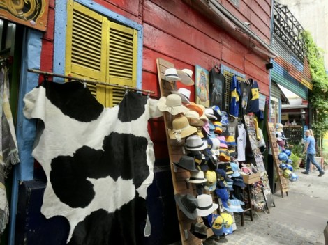 d. La Boca: a working-class neighbourhood near the docks where the late 1800s – early 1900s mass influx of European immigrants were housed in tenement rooms. Today the neighbourhood is centred around 2 things – the nearby football club (makes for rowdiness on game days) and the street artists, leather shops, and football club paraphanalia sold in all the highly colourful buildings surrounding Caminito. We were tempted by leather coats, shoes & handbags but alas! had no way to pack them & no time to get them shipped home (would have also meant another trip to Western Union…)