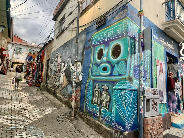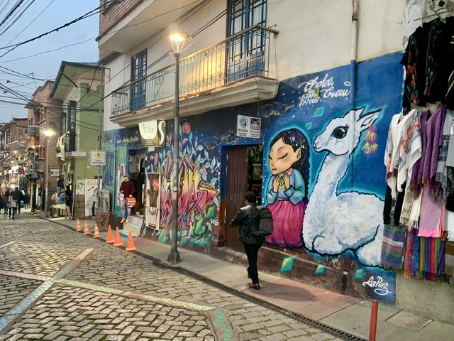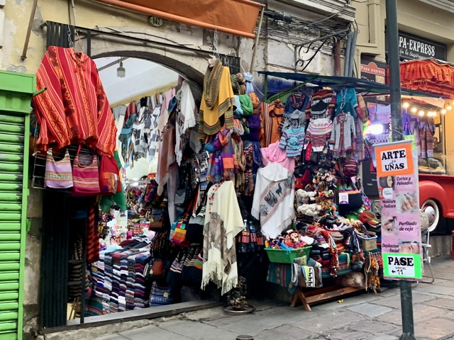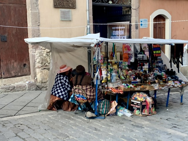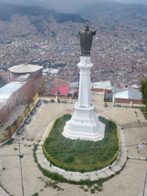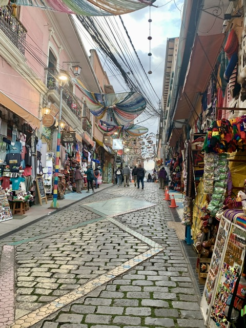With a population of approximately 2 million, La Paz is the administrative capital and the seat of Government. Flying from Sucre to La Paz, we could see the sprawling nature of this city, with La Paz proper in the low valley and El Alto about 500 hundred metres above and overlooking the centre. As we are not fond of huge cities, and with a tight timeline to get to Peru, we only spent one day here. But we were able to make the most of it by touring the city on the well-developed overhead tram system, saw the 16th C cathedral, and went to the markets, including the famous ‘Witches Market.’