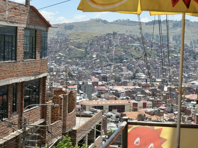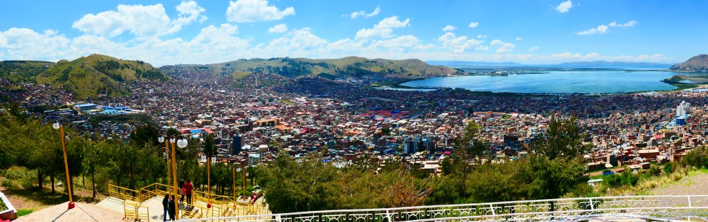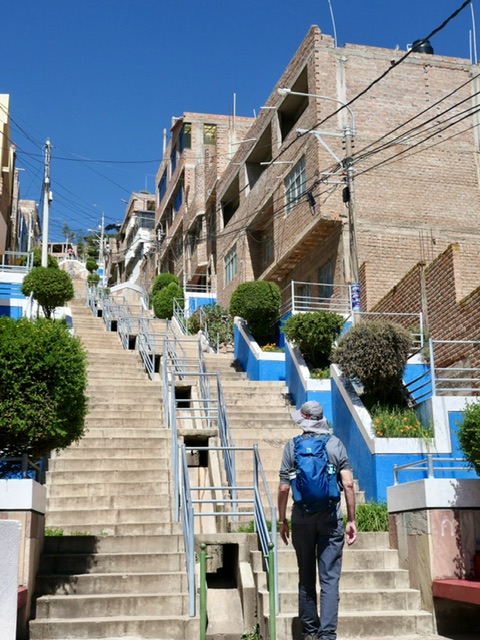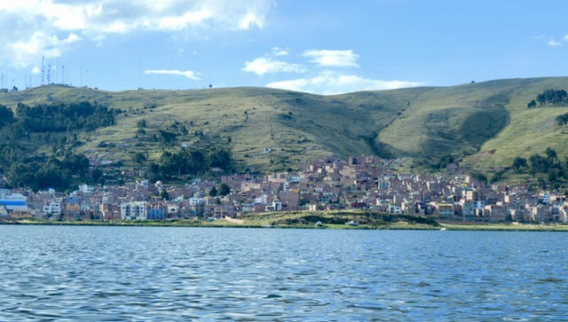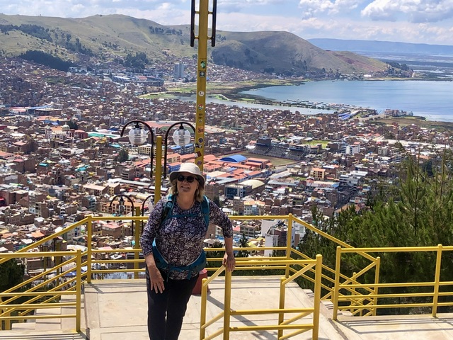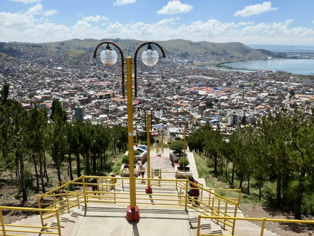 We had no idea that we were going to a city of 200,000 in a bay rising high above the lake. We split our explorations between a climb to a mirador, walk around the central plaza, and a tour to the Uros Islands (reed islands).