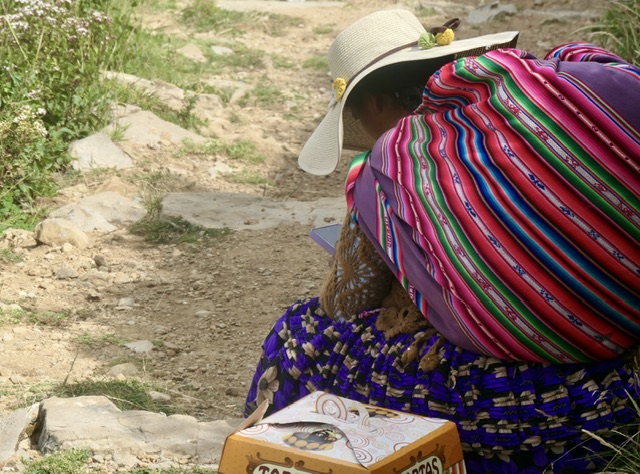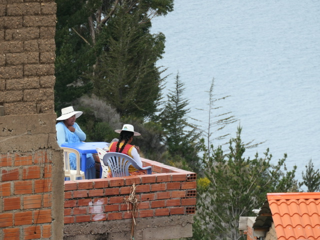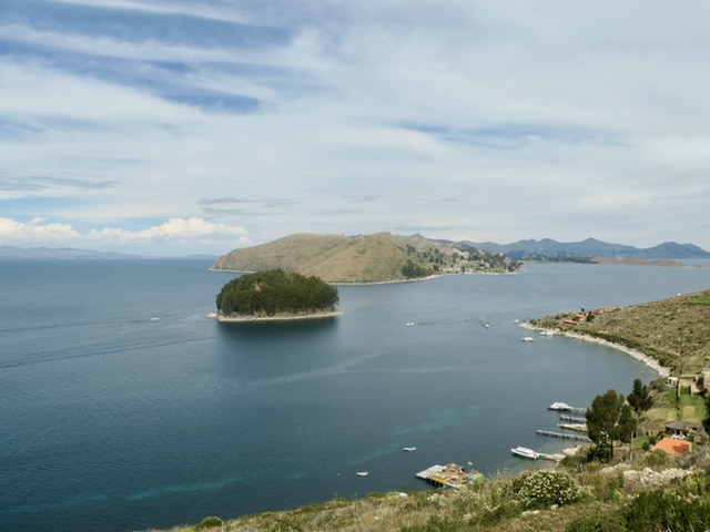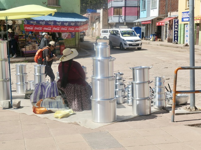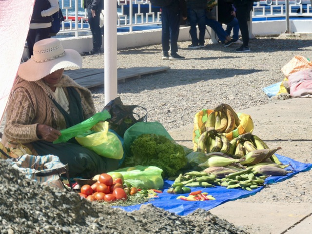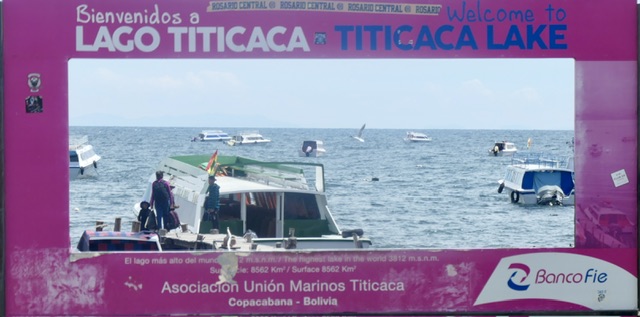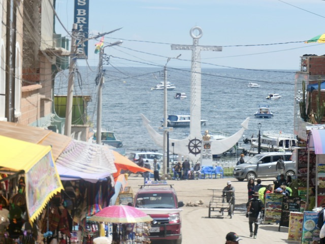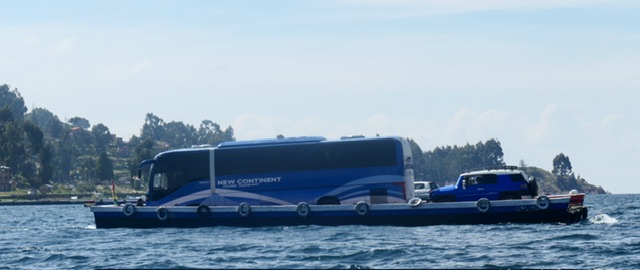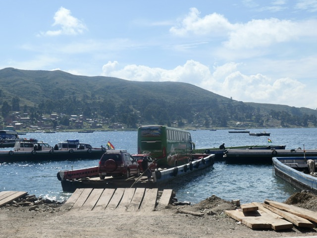 It’s a 4 hour journey between La Paz and Copacabana on the shore of Lake Titicaca. Once out of the extensive urban/suburban area, the farming region becomes scenic and on a clear day (which we did not have), several of the highest mountains in Bolivia are visible. About 3 hours after La Paz, there is a ‘ferry’ crossing that involves people going onto small boats and buses/cars going onto barges.