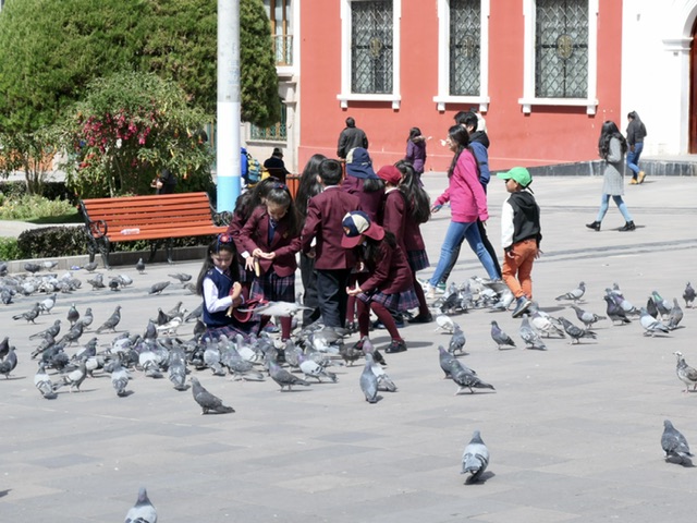 Children playing, pigeons, European style coffee house, alpaca shops, and the search for a money exchange.